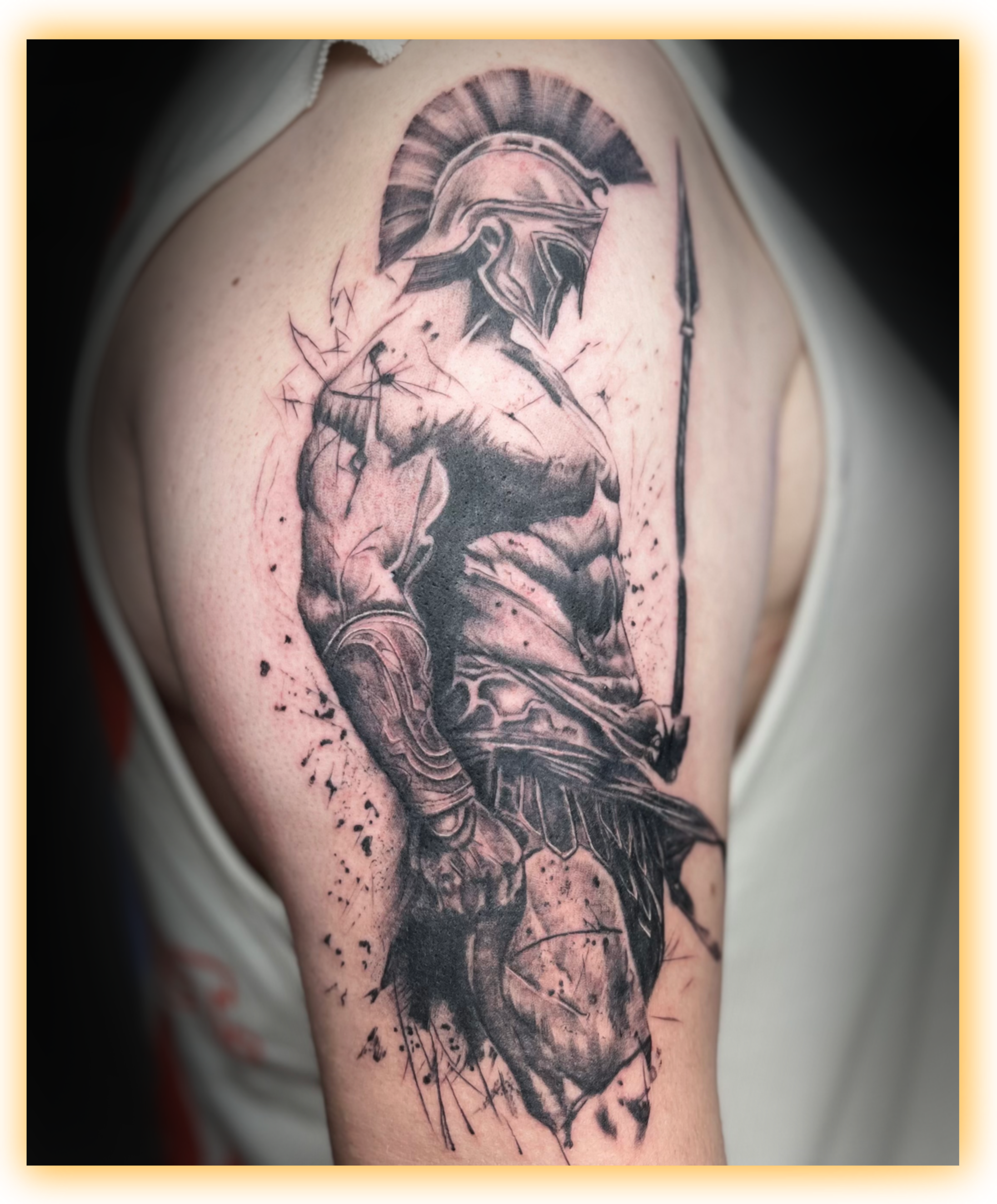 Athena, goddess of wisdom and war. The first session of a full sleeve in progress.